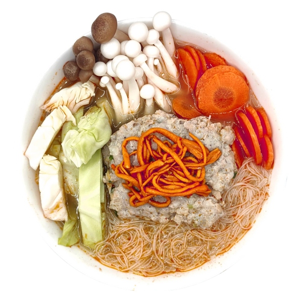Indulge in the vibrant flavors of our Tom Yum Steam Vermicelli with Pork Patty (蒸粉)! Freshly crafted with tender shimeji mushrooms, nutritious cordyceps militaris, crisp cabbage, and sweet carrots, this dish offers a delightful fusion of tangy Tom Yum spice and Asian-style bibimbap. The juicy pork patty and perfectly steamed vermicelli create a tantalizing blend of textures and tastes. Experience a culinary adventure that's both unique and irresistible—try it today!